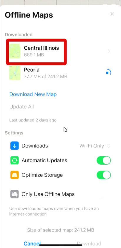17.Valittu kartta ladataan nyt iPhonellesi. Tämä voi kestää jonkin aikaa, riippuen verkon nopeudesta ja käytettävissä olevasta kaistanleveydestä.