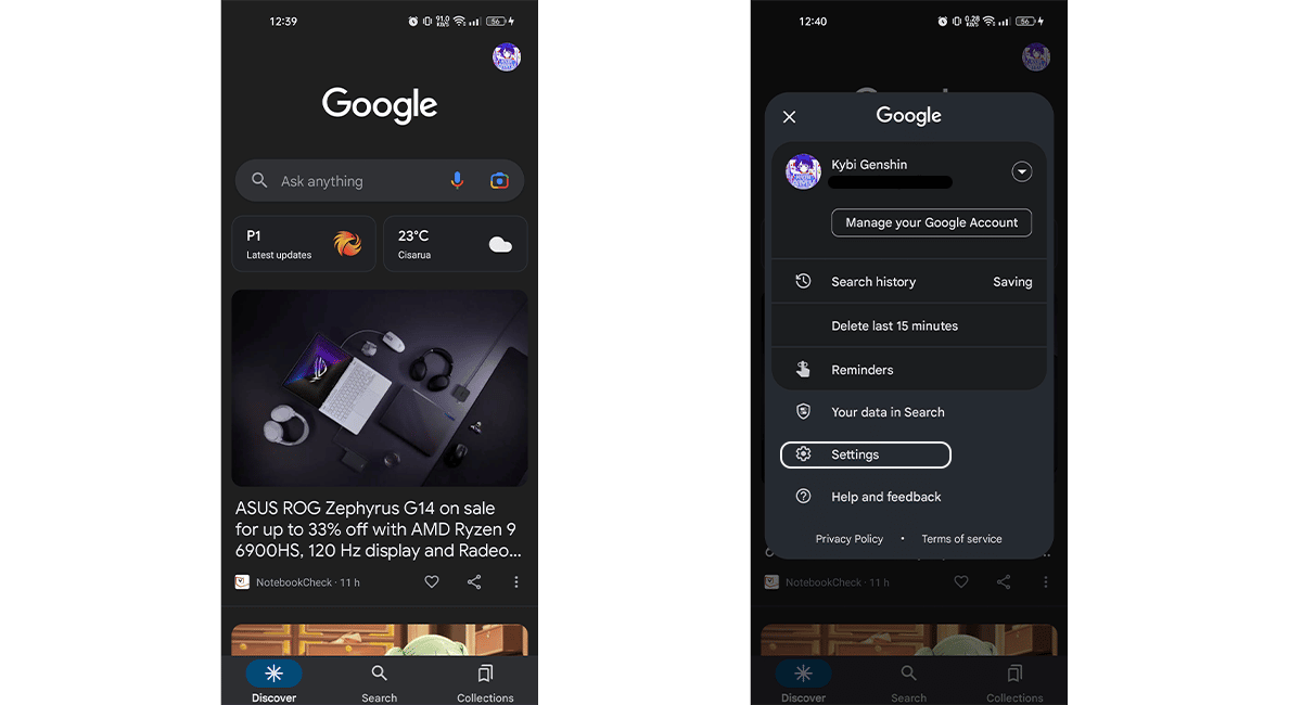 - Avaa Google -sovellus> Napsauta oikean yläkulman yläkulmaa> Napsauta asetuksia.
