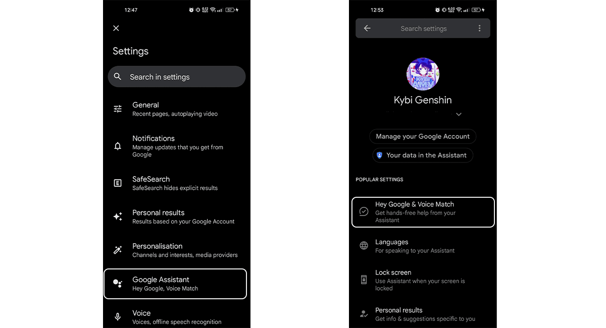 - Napauta asetuksissa “Google Assistant”> Napauta “Hey Google & Voice Match”.