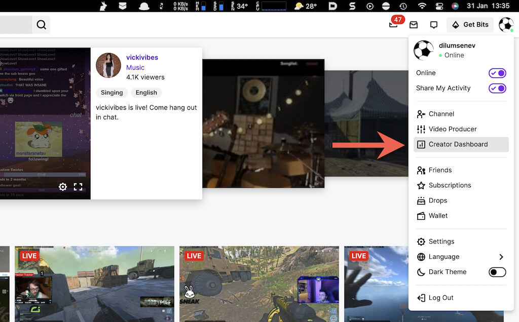 1. Avaa Twitch Web -sovellus Macissa tai tietokoneessa.