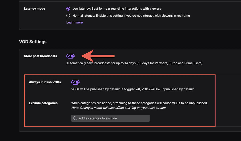 5. vieritä alasVOD -asetuksetJatka ja kytke kytkin päälleMyymälä menneitä lähetyksiä. Tämän tekeminen aktivoituu myösJulkaise aina Vods—Tuuntakaa se, jos et halua Twitchin julkaisemaan lähetyksiä ilman lupaa tai sulje pois tiettyjä VOD -luokkiaSulkea pois luokatlista.
