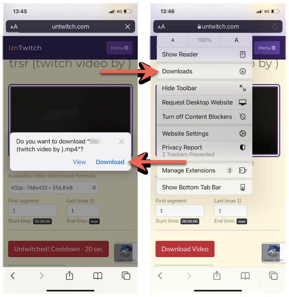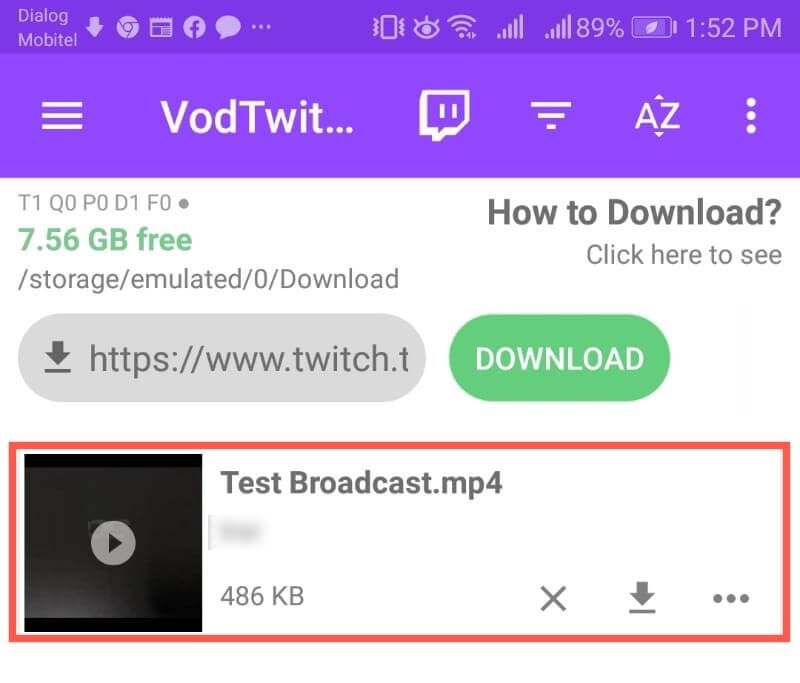 Voit kuitenkin tarttua Twitch VOD: n URL-osoitteeseen mobiilisovelluksen avulla ja ladata sen käyttämällä UNTWitch.com-sivustoa (kolmannen osapuolen Web Downloader for iPhone) tai Video Downloader for Twitch (Android for Android -sovellus).