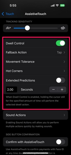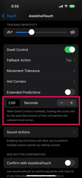 Kun laitteellasi on silmäseurantaominaisuuden aktivointi, on syytä huomata, että Rung -ohjausvaihtoehto on automaattisesti käytössä. Tämän vaihtoehdon avulla voit käytännössä suorittaa ennalta valittua toimintaa pitämällä katseesi vielä tietyn ajanjakson ajan navigoimalla silmäseurannan kanssa iPhonellasi.