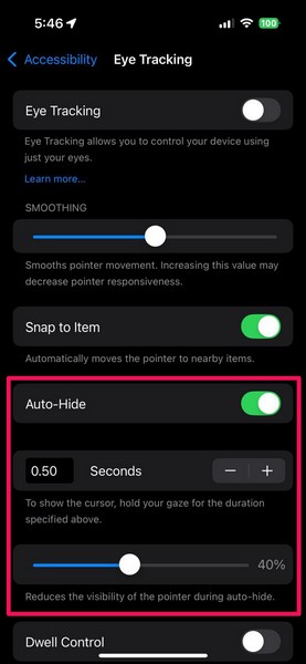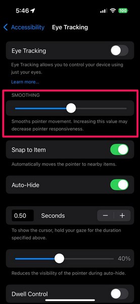 Nyt, jos haluat räätälöidä iPhone-silmäseurantaominaisuuden iOS 18: ssa, voit käyttää lisävaihtoehtoja, kuten tasoittamista, napsauttamista kohteeseen, automaattiseen piiloon ja asua hallinta sen asetussivulla.