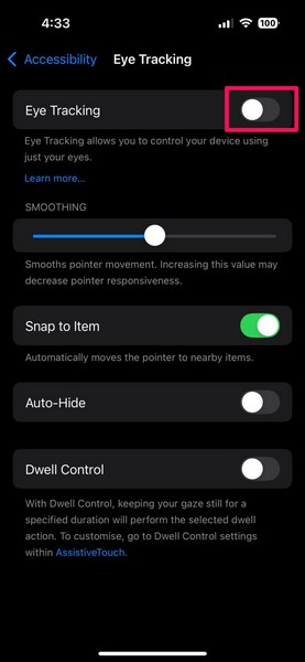 Silmien seurantaominaisuuden poistaminen iPhonessa on yhtä yksinkertaista kuin sen mahdollistaminen, paitsi että sinun ei tarvitse luonnollisesti käydä sen asennusprosessia. Lisäksi, kuten aiemmin mainittiin, jopa silmäseurannan ollessa käytössä ja käytössä, voit silti käyttää iPhonesi kosketustoimintoja sen hallitsemiseen.