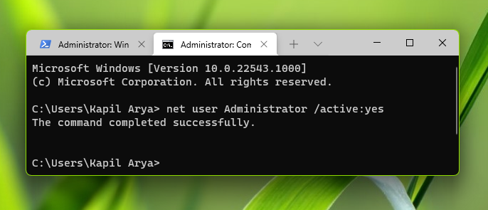net user Administrator <password> /active:yesYllä olevassa komennossa sinun on korvattava<password>todellisella salasanalla, jota haluat käyttää järjestelmänvalvojan tilillä.