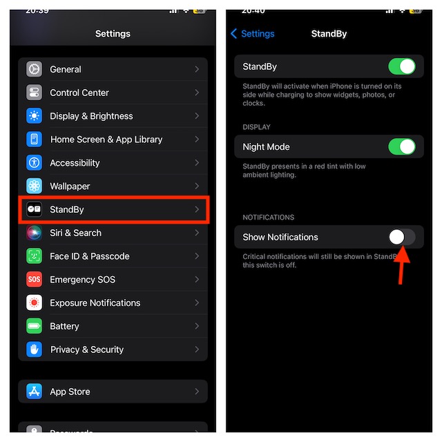 - Siirry "Asetukset" -sovellukseen iPhonessa -> “valmiustilassa” ja poista sitten vieressä oleva vaihto käytöstä ilmoituksia.