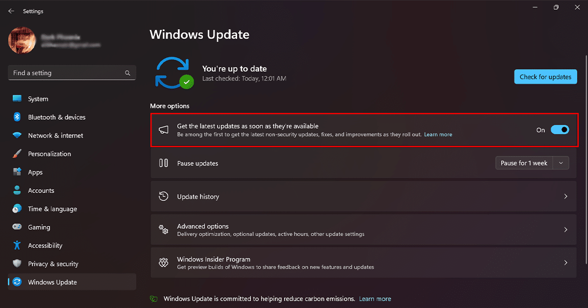 - NapsauttaaWindows Updateja kytke päälle ”Hanki uusimmat päivitykset heti, kun ne ovat saatavilla”Vaihda kytkin.