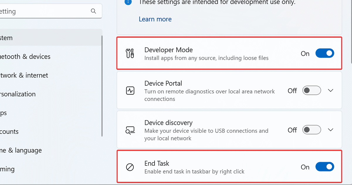 - Kytke ”Kehittäjätila"Ja"Päätehtävä”Vaihda kytkin.