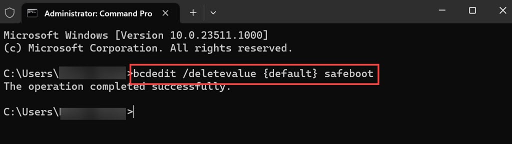 2.Kirjoita komentokehotteeseen komentobcdedit /deletevalue {default} safebootja painaEnter. Tämä komento muuttaa käynnistysasetuksia.
