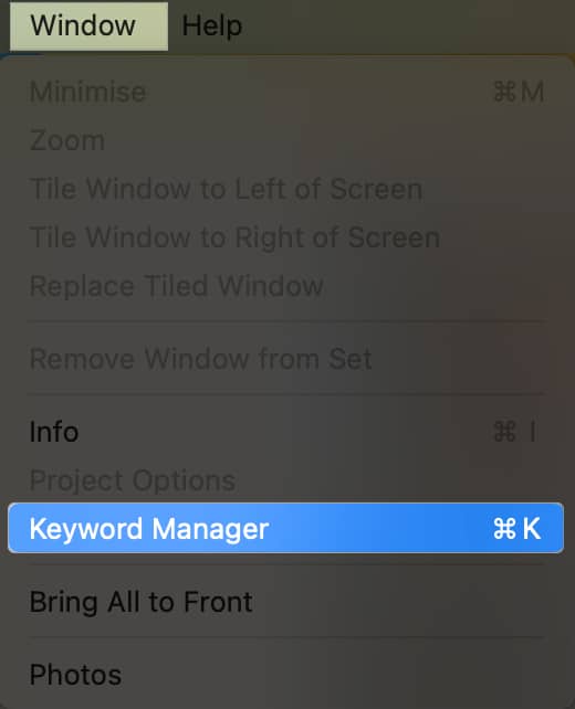 Voit tarkastella, lisätä ja poistaa avainsanoja Avainsanojen hallinnassa. ValitseIkkunavalikkopalkissa ja valitseAvainsanojen hallinta.