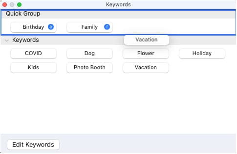 Voit myös lisätä avainsanoja alareunassa olevasta luettelostaNopea ryhmäalue yläosassa. Tämän avulla voit nopeasti merkitä valokuvia avainsanoilla määrittämiesi pikanäppäimien avulla. Valokuvat myös sijoittavat kyseiset avainsanat suodattimiin (kuvattu alla) ja tarjoavat ne ehdotuksiksi, kun määrität avainsanoja.