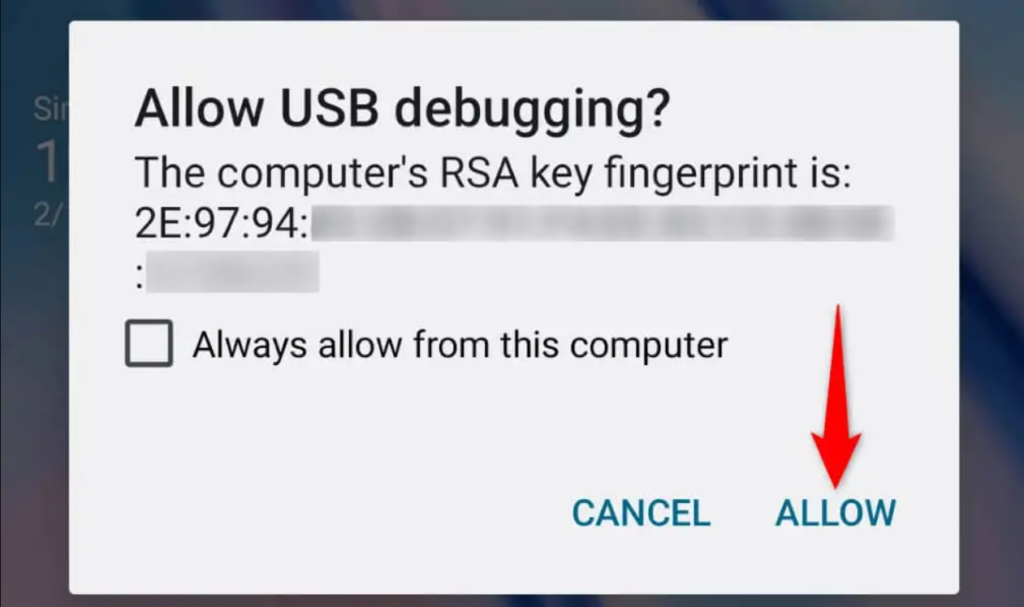 adb devices4.Lopuksi, napautaSALLIvaihtoehto matkapuhelimesi kehotteessa yhdistääksesi molemmat laitteet ADB:n avulla.