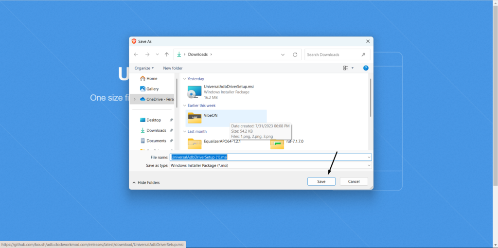 2.VuonnaTallenna nimelläikkuna, napsautaTallentaaladataksesi välttämättömän ADB-ohjaimen Windows 11 -kannettavallesi.