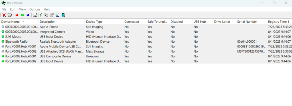 6.Etsi USBDeview-ohjelman ikkunasta ajurit, joissa onHarmaajaVihreät pisteetheidän vieressään. Varmista myös, että niiden otsikossa on tietyt sanat, kuten Linux, Google ja ADB.