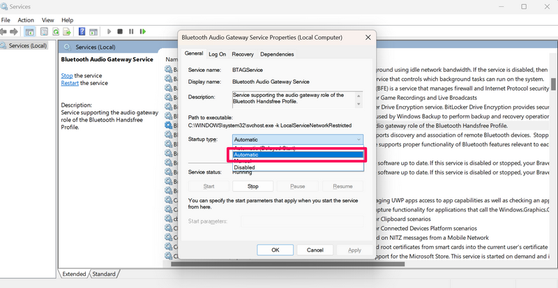 7. Varmista, että Bluetooth -palvelut on asetettu automaattisesti Windows 11: ssä