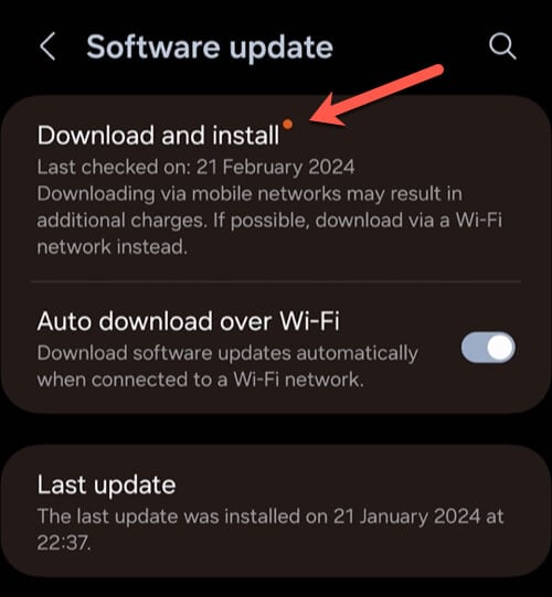 - Laitteesi tarkistaa käytettävissä olevat päivitykset. Jos päivitys löytyy, noudata näytön kehotuksia aloittaaksesi latauksen tai napautaLataa ja asennaaloittaa prosessi.