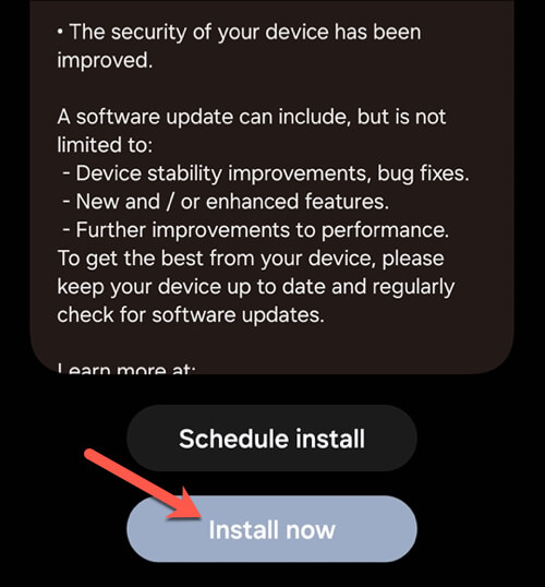 - Kun päivitys on valmis aloittamaan asennus, napautaAsenna nyt. Kun päivitys on asennettu, puhelimesi käynnistyy automaattisesti prosessin loppuun saattamiseksi.