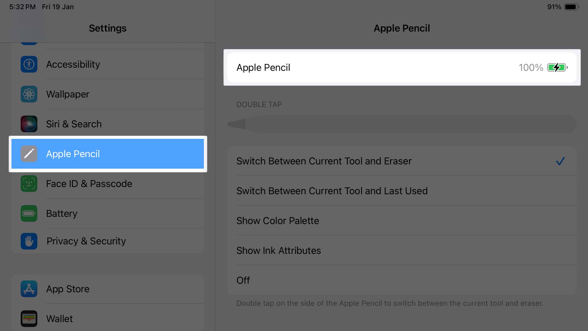 Toisinaan, vaikka lyijykynä olisi kytketty ja latautuu, et ehkä näe ilmoitusta yläreunassa. Joten vahvistaaksesi, meneiPad -asetukset→ Tarkista, löydätköOmenakynävasemmassa ruudussa. Jos kyllä, napautaOmenakynä→ Etsi lataustila oikeasta ruudusta.