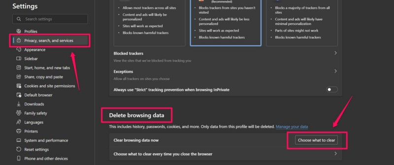 3.AllaTietosuoja, haku- ja palvelut -välilehtiNapsauta vasemmassa nav -palkissaValitse mitä tyhjentää -painikevieressäTyhjennä selaintiedot nyt vaihtoehtoallaPoista selaustiedot -osa.