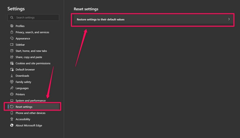 Jos Windows 11 -tietokoneen tai kannettavan tietokoneen verkkoselaimen päivittäminen ei ratkaise ”Sovellusvirhe: Asiakaspuolen poikkeus on tapahtunut” -virhe, voit yrittää palauttaa selaimen asetukset. Windows 11 -laitteen selaimen asetusten palauttaminen palauttaa kaikkien selaimen kaikkien asetusten oletusarvot, joissa kohtaat virheen. Joten, jos asiakaspuolen poikkeusvirhe on seurausta väärän määritetyn selaimen asettamisesta, tämän menetelmän pitäisi pystyä korjaamaan se.