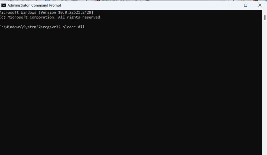 Vaihe 2 -Kun komentokehotus avaa kopiointia ja liitäregsvr32 oleacc.dllja painaKirjoittaa.