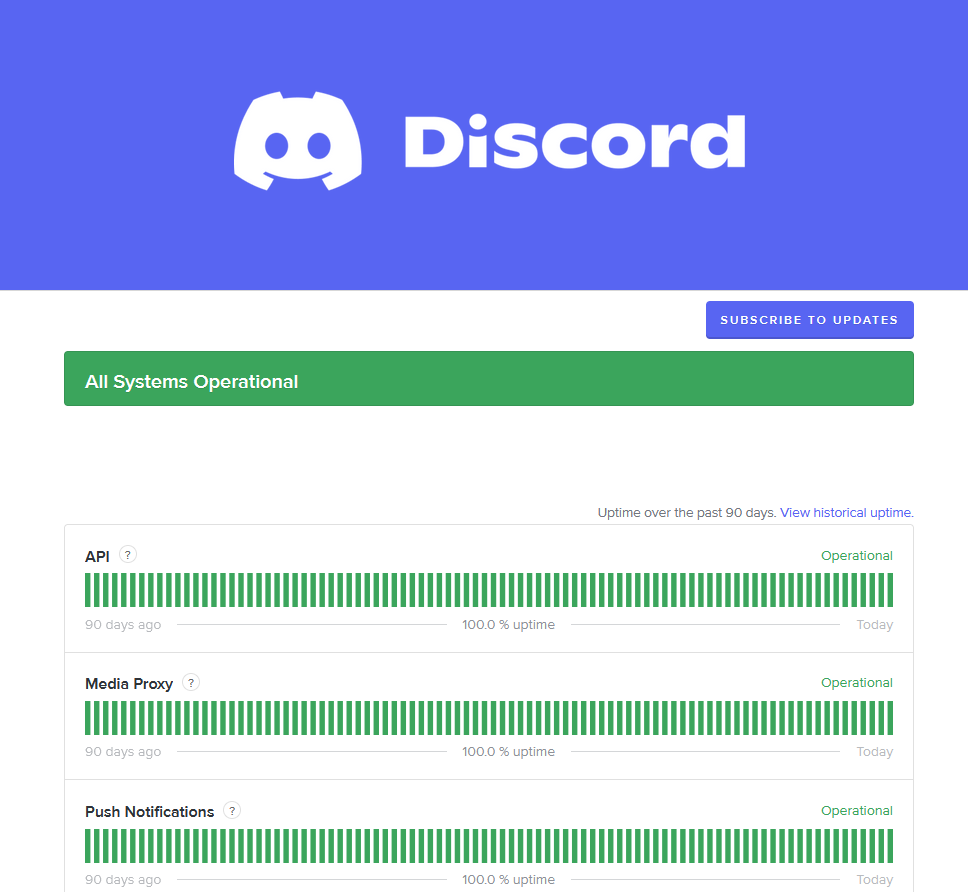 Voit tehdä sen käymälläDiscordin tilasivuja nykyisen tilan tarkistaminen. Lisäksi sivulla voit myös nähdä järjestelmämittarit, aiemmat ilmoitetut tapaukset ja kunkin ilmoitetun tapauksen tilan.