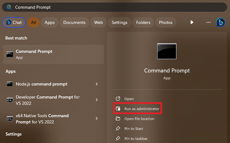 1.Etsiä jtkKomentokehotusKäynnistä -valikon hakupalkissa ja napsautaJärjestelmänvalvojanavaihtoehto.