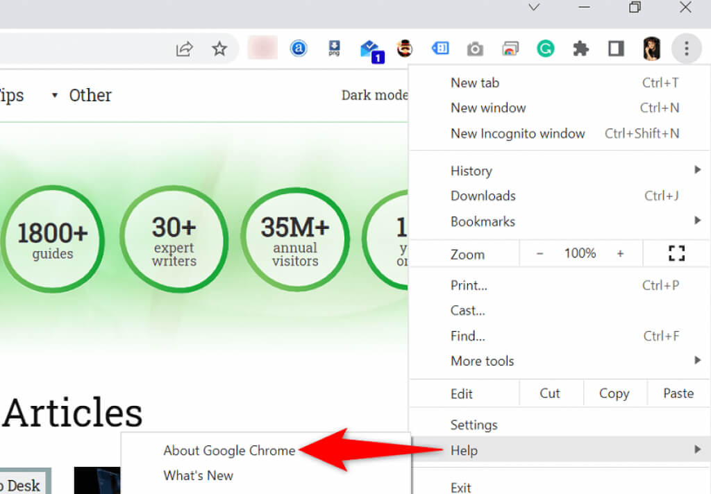 - KäynnistääKromi, valitse kolme pistettä oikeassa yläkulmassa ja valitseAuttaa-Tietoja Google Chromesta.