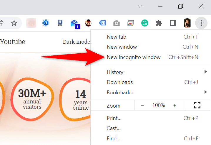 - AvataKromi, valitse kolme pistettä oikeassa yläkulmassa ja valitseUusi inkognito -ikkuna.