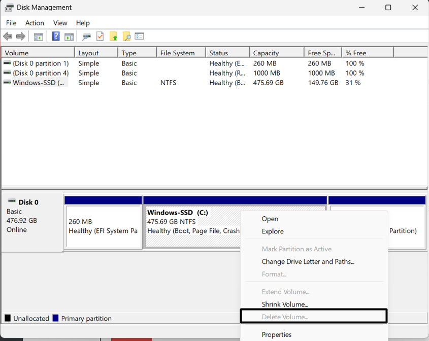 Toinen tapa korjata Extend Volume -vaihtoehto, joka näkyy harmaana Windows 11:ssä, onpoista taltio Levynhallintaohjelmasta. Tämä poistaa tallennusaseman Windows 11 -tietokoneeltasi.