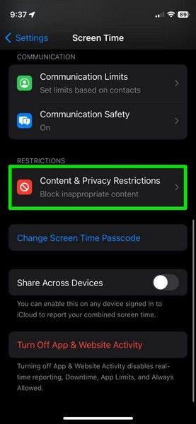 3.Vieritä alas löytääksesiSisältö- ja yksityisyyden suojaa koskevat rajoituksetvaihtoehto jaNapauta sitä avataksesi.