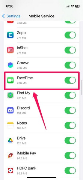 6. Varmista, että FaceTime on käytössä solutietoihin