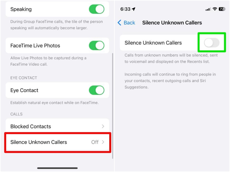 4.Toinen tärkeä FaceTime -asetus, jonka sinun tulisi poistaa käytöstä, jotta vältetään facetime, joka ei toimi iPhonessa, on hiljaisuuden tuntematon soittajat. Joten vieritä FaceTime Asetukset -sivulla alaspäin ja varmista, ettäHiljaisuus tuntemattomat soittajatvaihtoehto onPoisiPhonellasi. Jos ei ole,Napauta sitä avataksesija sittenNapauta vaihtoa poistaaksesi asetus käytöstäiPhonellasi.