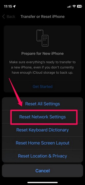Jos FaceTime ei toimi -ongelma on seurausta mistä tahansa iPhonen verkkoongelmasta, voit yrittää palauttaa laitteen verkkoasetukset. Muista kuitenkin, että iPhonen verkkoasetusten palauttaminen unohtaa kaikki aiemmin kytketyt Wi-Fi-verkot ja Bluetooth-laitteet ja palauttaa kaikki verkkoasetukset oletusarvoihinsa.