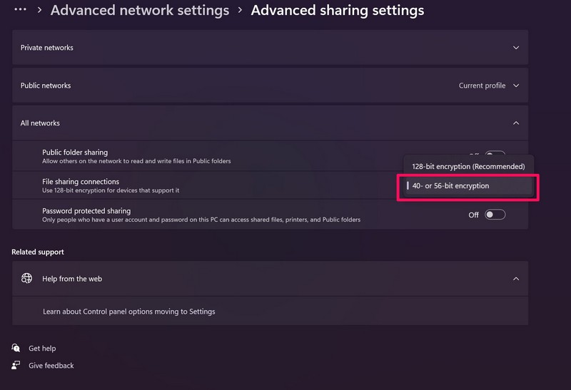 3.Napsauta nyt avattavasta vaihtoehtoaTiedostojen jakamisyhteydetja asettaa sen40- tai 56-bittinen tarttuminenasetus.