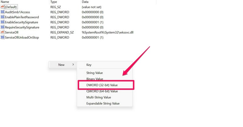 5.AllaUusiValitse vaihtoehto, valitseD-sana (32-bittinen) arvomahdollisuus luoda uusi avain.