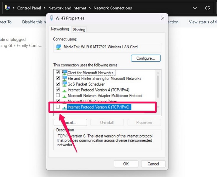 Toinen ratkaisu, jota voit kokeilla, kun tiedostojen jakamisominaisuus lakkaa toimimasta Windows 11: ssä, on laitteen IPv6 -verkkoprotokollan poistaminen käytöstä. Jos haluat tehdä tämän, noudata alla olevia vaiheita: