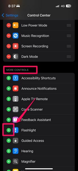 5.Kun olet poistanut taskulampun mukana toimitetusta ohjausosasta, vieritä alaspäin löytääksesi senLisää säätimiäja napautaVihreä väri + (plus) -painikeOsoitetun taskulamppu-painikkeen lisääminen ohjauskeskukseen.