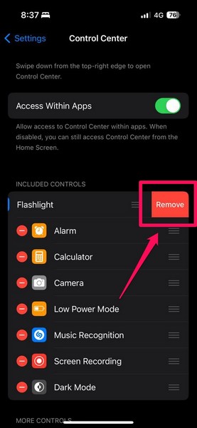 Voit noudattaa alla olevia vaiheita poistaaksesi taskulamppu-painikkeen ohjauskeskuksesta ja lisät sitten sen uudelleen sieltä iPhonessa: