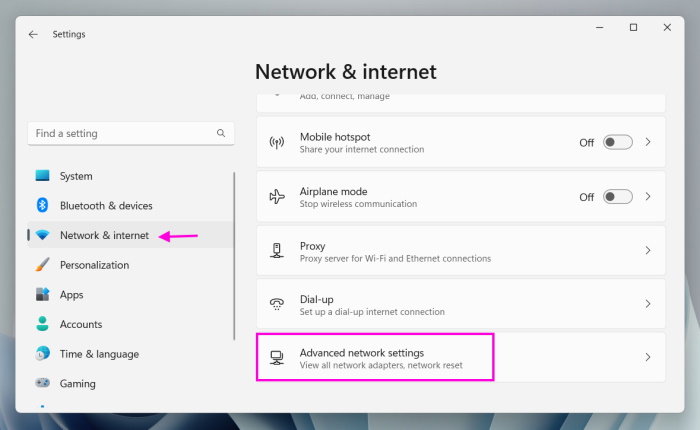 2.SiinäVerkko ja InternetIkkuna, valitseEdistyneiden verkkoasetuksetja sittenVerkon palautus.