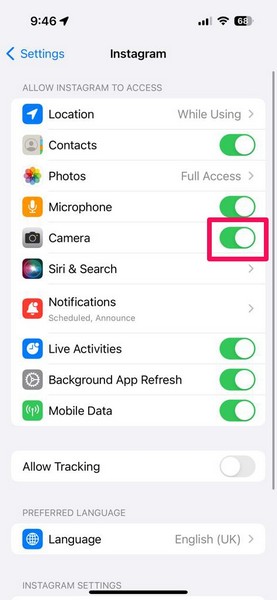 Nyt, jos koet etukameran, joka ei toimi kolmannen osapuolen sovelluksessa, kuten Instagram iPhonessa, on mahdollista, että sovelluksella ei ole pääsyä laitteen kameroihin. Jos näin on todellakin, etukamera tai takakamerat eivät toimi iPhone -sovelluksen sisällä olevassa sovelluksessa.