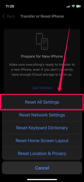 5.Valitse sittenNollaa kaikki asetuksetReset -prosessin käynnistämiseksi näyttöön aukeavassa ylivuotovalikossa.