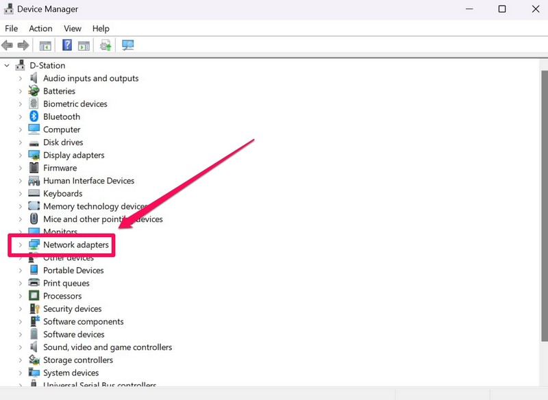 3.Kun laitehallinta avautuu Windows 11: ssä, napsauta pientä nuolta vieressäVerkkosovittimetmahdollisuus laajentaa sitä.