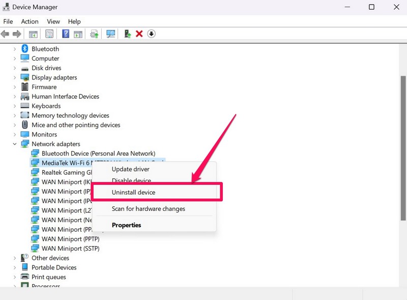 IT: n vanhentuneet verkkosovittimet tai pienet ongelmat voivat aiheuttaa myös ongelmia FTP-asiakkaan kanssa Windows 11: ssä. Tässä tapauksessa voit poistaa laitteen verkkosovittimen ja asentaa sen uudelleen korjaamaan FTP-asiakas, joka ei toimi Windows 11 -ongelmassa. Joten asentaaksesi verkkosovittimen Windows 11: ssä, noudata alla olevia vaiheita: