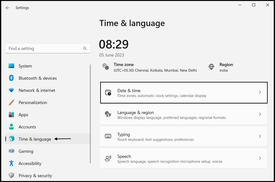 1.KäynnistäAsetukset-sovellusWindows 11 -tietokoneellasi ja valitseAika & kielivaihtoehto vasemmalta.