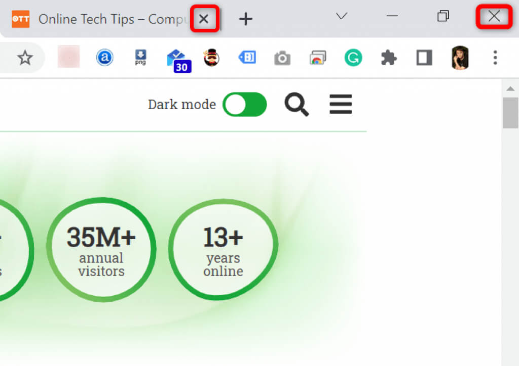 Jos Chromen muisti loppuu -virhe jatkuu, yritä sulkea selain ja avata se uudelleen. Näin selain voi sammuttaa kaikki ominaisuudet ja ottaa ne takaisin käyttöön. Voit korjata monia pieniä ongelmia tällä menetelmällä.