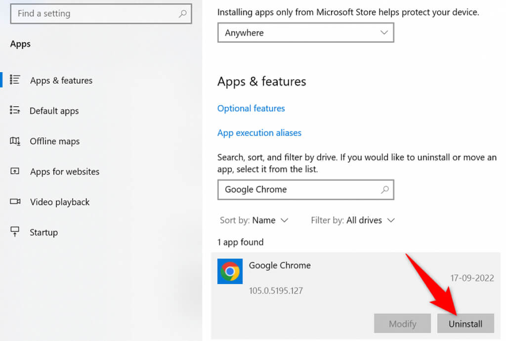 - ValitaGoogle Chromeluettelosta ja valitsePoista asennus.