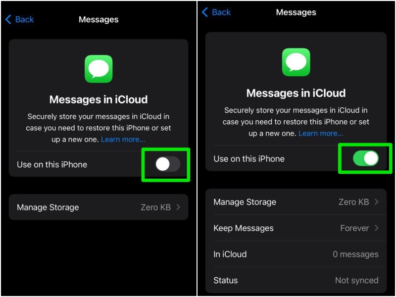 Nyt, kun se on sovitettu iPhoneen ja iMessagen Apple -tunnisteisiin iPhonessa, viestit eivät välttämättä synkronoi kaikissa Apple -laitteissasi. Tämä johtuu siitä, että sinun on otettava käyttöön synkronointi ICloudissa iOS -laitteessasi. Vasta sen jälkeen iPhone alkaa synkronoida viestejä iCloudissa ja antaa sinun käyttää niitä kaikkiin Apple -laitteisiin, jotka on kirjautunut sisään ensisijaisella Apple -tunnuksellasi.