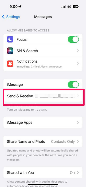 Voit avata iMessage Asetukset -sivun iPhonessa, kirjautua siihen liittyvä Apple ID -sovelluksen lähetys- ja vastaanotto -valikon kautta ja kirjautua sisään ensisijaisella Apple -tunnuksellasi, joka on kytketty iPloudiin iPhonessa.